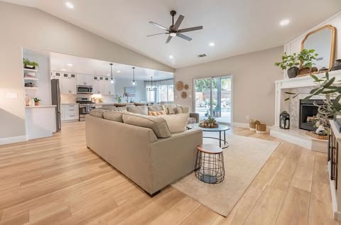 Durable 7”x48” Luxury Vinyl Tile planks enhance the interior while flowing seamlessly to the outdoors with matching 8”x47” porcelain pavers from our Arterra® collection.